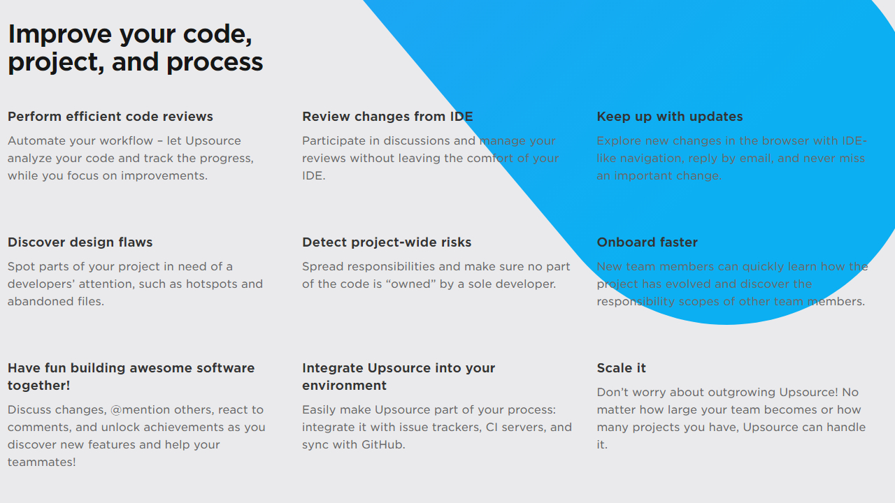 Upsource简介 Upsource是Jetbrains公司出品的一款Code Review工具,通过与版本管理软件( Git、 Mercurial、 Subversion 和 Perforce)结合,通过社交化的形式,将代码予以团队成员或其他人分享、讨论。 执行高效的代码评审 自动化您的工作流程-让UpSource分析您的代码和跟踪进度,而您专注于改进。 检查IDE中的更改 参与讨论和管理您的评论,而不离开您的IDE舒适。 跟上更新 使用IDE之类的导航,通过电子邮件回复浏览器中的新变化,永远不会错过一个重要的更改。 发现设计缺陷 找出项目中需要开发人员关注的部分,比如热点和废弃的文件。 检测项目范围内的风险 分散责任,并确保代码的任何部分都不是由唯一的开发人员"拥有"的。 上船更快 新的团队成员可以快速了解项目是如何发展的,并发现其他团队成员的责任范围。 有乐趣的建立可怕的软件在一起! 讨论变化,@提及他人,对评论做出反应,并在发现新特性和帮助队友时解锁成就! 将UpSource集成到您的环境中 轻松地使UpSource成为您的流程的一部分:将其与问题跟踪器、CI服务器集成,并与GitHub同步。 刻度 不要担心超越源!无论您的团队规模有多大,或者您有多少项目,UpSource都可以处理它。
