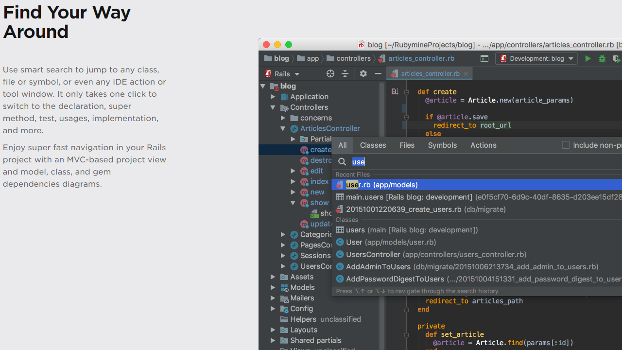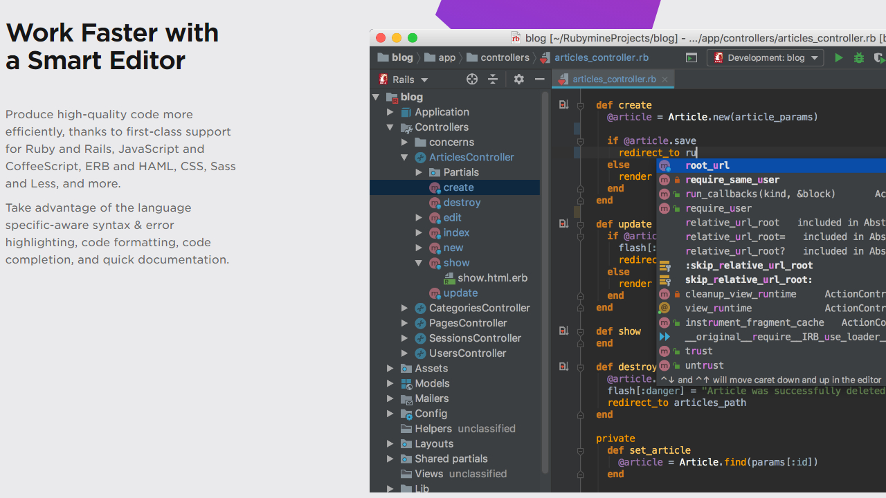 RubyMine简介 用智能编辑器更快地工作 由于对Ruby和Rails、JavaScript和CoffeeScript、ERB和HAML、CSS、Sass等的一流支持,能够更有效地生成高质量的代码。 利用语言特有的语法和错误突出显示、代码格式化、代码完成和快速文档。 找到你的路 使用智能搜索可跳转到任何类、文件或符号,甚至任何IDE操作或工具窗口。只需单击一次即可切换到声明、超级方法、测试、使用、实现等。 使用基于MVC的项目视图和模型、类和宝石依赖关系图,享受Rails项目中的超级快速导航。 检测和消除代码嗅探 遵循社区的最佳实践,检查代码,验证您的代码是否存在许多可能的错误,并提供快速修复选项的即时改进。 自动化但安全的重构有助于清理代码并使其更易于维护。Rails感知的重构帮助您执行项目范围的更改:例如,重命名控制器也会重命名助手、视图和测试。 愉快地测试和调试 使用强大的调试器,为Ruby、JavaScript和CoffeeScript提供图形用户界面。设置断点,逐步运行代码,并利用指尖上的所有可用信息。 创建并运行RSpec,Cucumber,Shoulda,MiniTest&Test::具有编码辅助和基于GUI的测试运行程序的单元测试。 【更新日志】 性能优化,提升软件体验