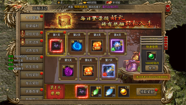 新手上线首要任务是每日登录领取奖励,首日即可获得1阶攻击宝石等实用道具。同时参与“五虎试炼”和“等级竞技”等开服活动,可以快速积累元宝、经验丹等前期资源,助力角色快速起飞。