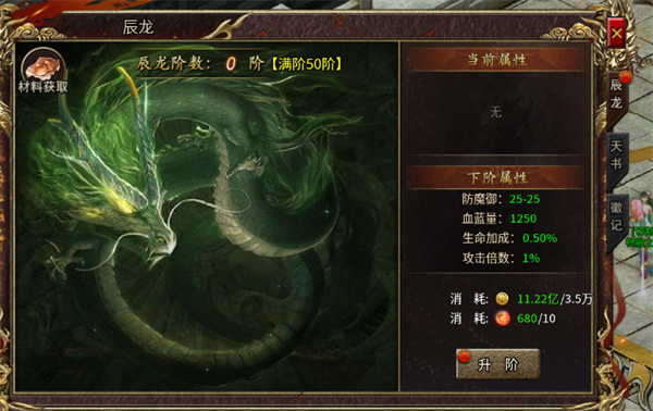 辰龙:消耗蛮荒币和龙元进行升级,主要提升防御、生命加成、攻击倍数