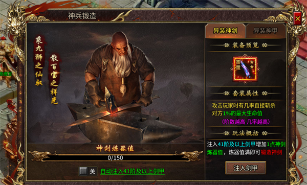 打造条件:注入对应等级的剑甲装备打造神剑,注入首饰装备打造神甲