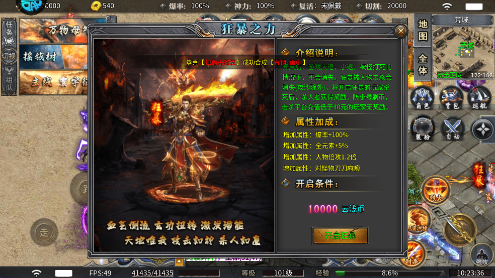 开启后,游戏大退,小退,被怪打死的情况下,不会消失。狂暴被人物击杀会消失(攻沙除外)将开启狂暴的玩家杀死后,杀人者获得奖励。防小号刷市,击杀平台充值低于10元的玩家无奖励。