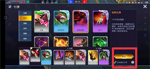 7、击杀小兵,敌人,野区动物都会获得金币,金币可以用来购买各种有利的卡牌,在卡牌中选择有用的卡牌后,点击预选后就会在金币满足时自动激活啦