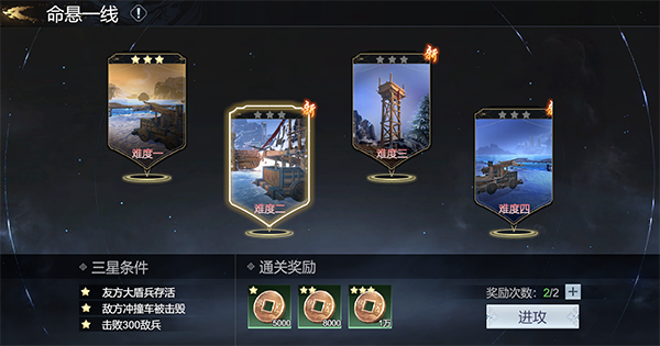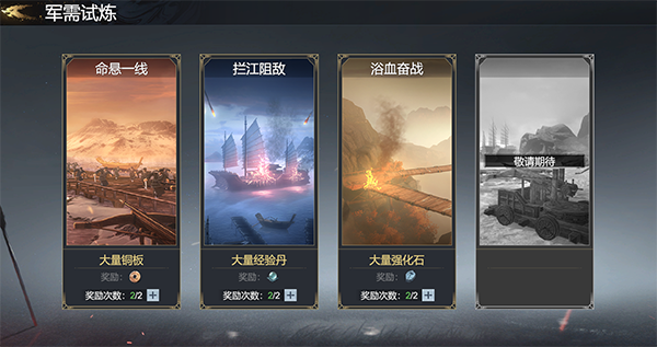 在军需试炼的每个玩法都会获得不同的奖励,在这些玩法中,通关时星级评价越高,奖励越丰厚。将军每天在单个玩法中有2次免费的获取奖励次数,该奖励次数于每日5:00重置。若未能3星通关,可退出关卡重新挑战,退出关卡不消耗奖励领取次数,3星通关后可开启扫荡模式。