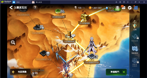 在《第七史诗》里,每一个地区会代表着游戏故事的一个章节,因此探索地区时,将可以了解对应章节的主线故事。在地区地图的介面里,点击右侧栏位的「任务」图示,你便可查看当前章节的任务。每一个章节会包含数个任务,点击任务标签右侧的「前往」图示,便可直接执行该任务。完成每一项任务时,将可以领取对应的奖励。完成章节的所有任务后,还可以领取章节的奖励。