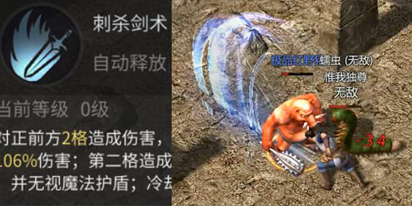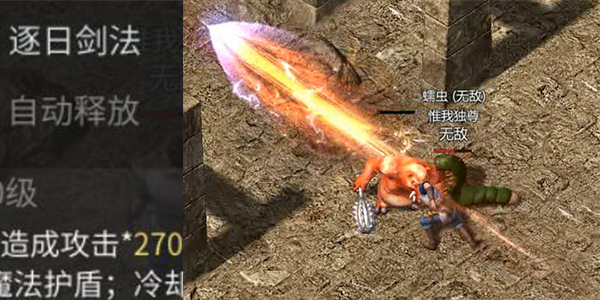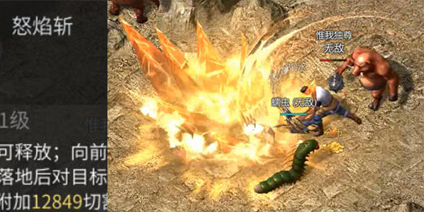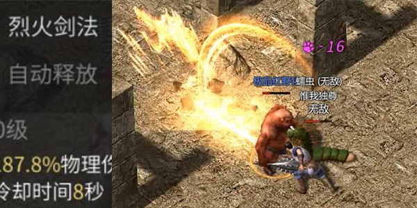 烈火剑法:战士的高级技能,将焚尽一切的烈焰附着于刀锋之上,造成大量伤害的同时有几率无视魔法护盾。