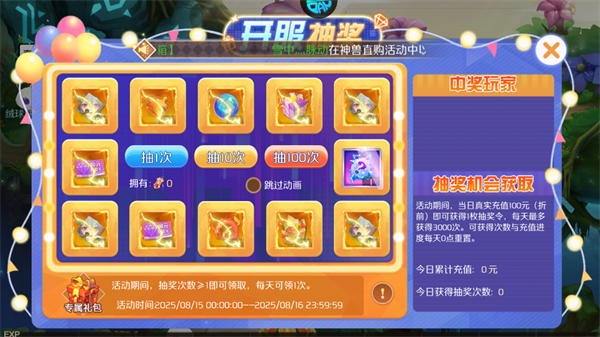活动期间,当日真实充值100元(折前)即可获得1枚抽奖令,每天最多获得3000次,令牌则可兑换物资,可获得次数与充值进度每天0点重置。