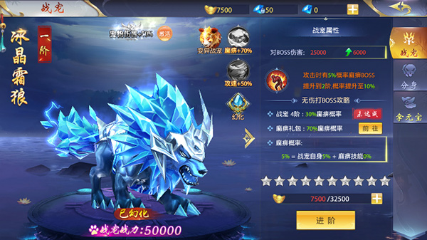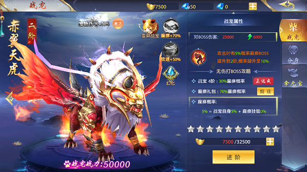 2、想提升战宠的战斗力,升阶是最快的方式,不过升阶需要大量元宝,需要玩家将资源倾斜在这方面。