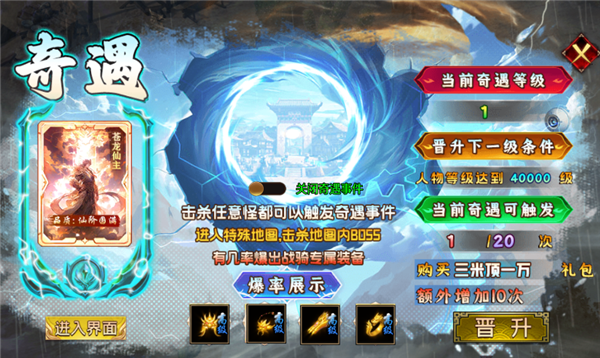 击杀任意怪都可以触发奇遇事件,进人特殊地图,击杀地图内BOSS,有几率爆出战骑专属装备。