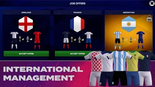 现在,您可以 在重大锦标赛中管理国际团队,与您所在大陆和世界各地的其他团队竞争。享受 令人惊叹的比赛和环境视觉效果,前所未有的球员肖像和动画效果!随着您成为冠军,处理 转会、训练、战术和阵型,并发展您的足球俱乐部的设施。