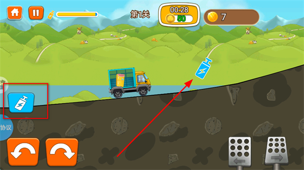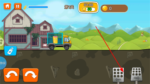 2、关卡中,点击右侧前进和后退,操控货车在山地地形行驶,完成送货任务。