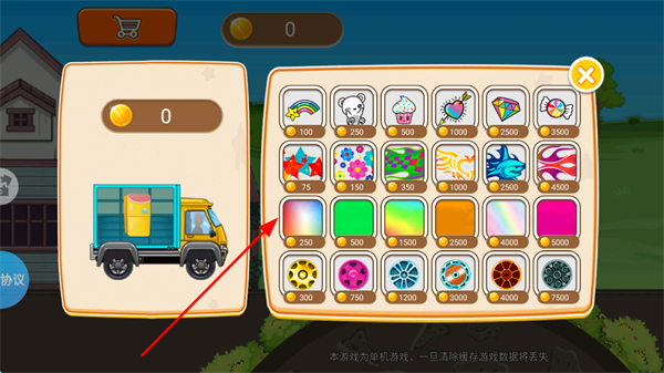 1、进入游戏后,可在商店花费金币,为货车购买装饰贴纸和车轮,改装车辆外观。