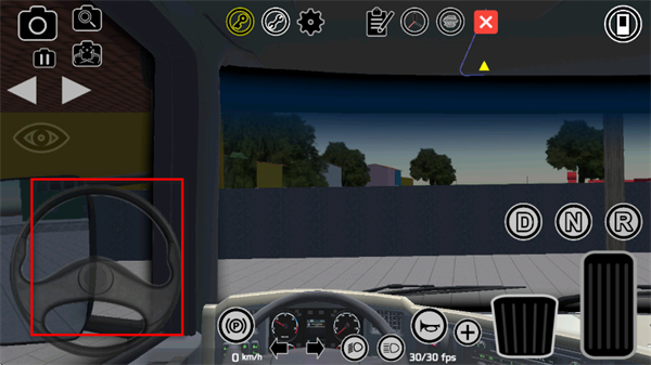 1、进入驾驶界面,点击左侧方向盘区域,操控卡车行驶方向,调整前行或转向轨迹。