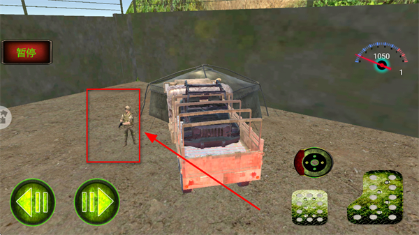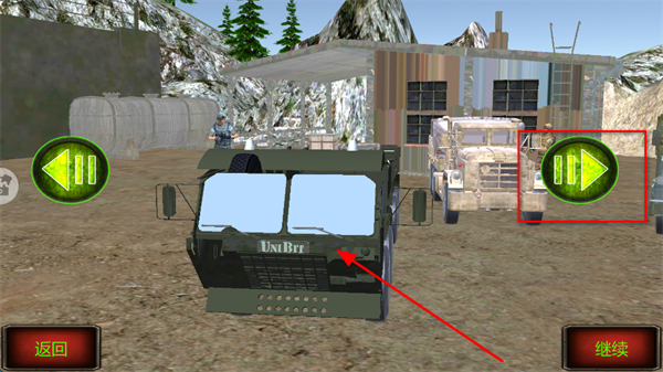1、点击右侧前进按键,操控卡车在军事基地等场景中启动,准备运输任务。