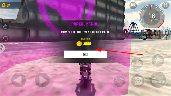 2、驾驶试炼关卡中,点击GO按键,接受任务挑战,驾驶摩托在工地赛道竞速。