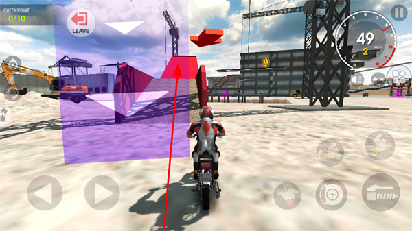 3、点击方向按键控制摩托行驶,穿过紫色障碍区域,按指引路线完成关卡目标。