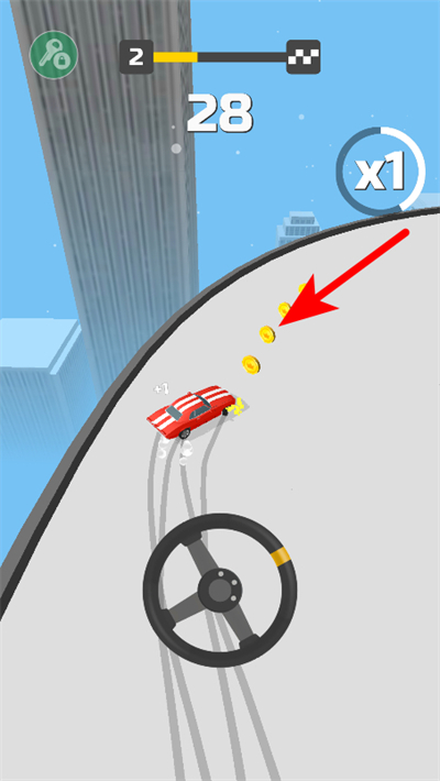 3、漂移时尽量让赛车贴近赛道金币区域,收集金币可提升闯关的积分与奖励。