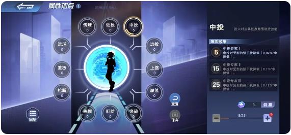 在属性加点系统中,球员的每一个属性最多只能加到25点,并且一个角色的总属性加点不能超过100点,玩家需要更加合理地分配属性点。每次球员的属性点增加到5/15/25点后还会激活对应的加点技能,提升球员的实力,但仅对当前球员生效。