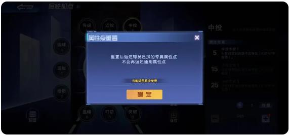 在属性加点系统中,还加入了重置的功能,帮助那些想要更改球员属性点的玩家重新加点,但是需要注意的是重置后只会返还球员已使用的专属属性点,不会再返还通用属性点。并且每一个球员除首次重置免费外,后续再重置需要支付相应的银球币,一个重置的次数越多,支付的银球币也会增加。所以玩家每次加点的时候一定要慎重一点!
