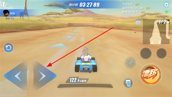2、进入赛车对局,点击方向控制车辆行驶,把握赛道走向,提升行驶速度,完成赛道挑战。