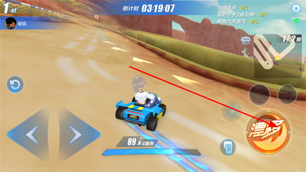 3、过弯时点击漂移,触发漂移效果,积攒氮气,提升车速,更快完成赛道,达成任务要求。