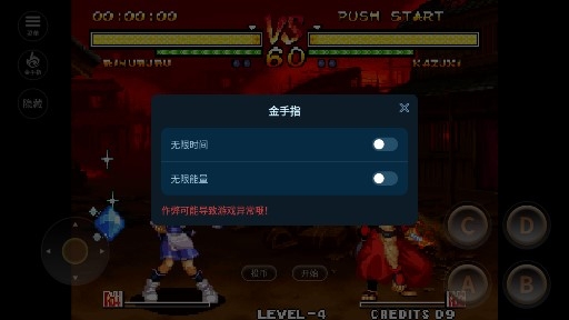 各种角色,不限时间的格斗。点击投币免费玩,内置金手指,无限时间,无限能量《侍魂》系列传统的设定,具备像是怒气计量表,超必杀武器击飞技等设定,而本代中还加入了剑气计量表的新系统,代表角色的攻击力,此计量表会随着玩家的出招而逐渐下降,受攻击时则慢慢回复。游戏内置金手指,点击左边金手指按钮即可开启1.无限时间2.无限能量