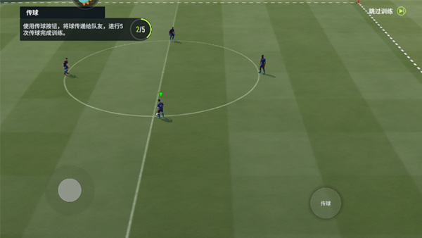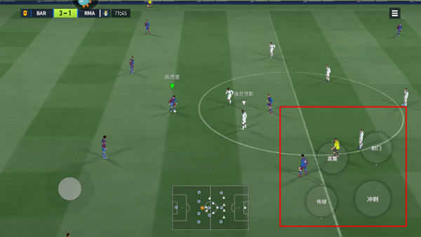 左边虚拟摇杆控制人物移动,右边传球按钮可以将足球传给指定的队友。