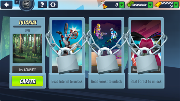 3、初次进入游戏时,必须先完成【TUTORIAL】教程关卡,才能解锁后续关卡。点击【CAREER】进入教程关卡开始挑战。