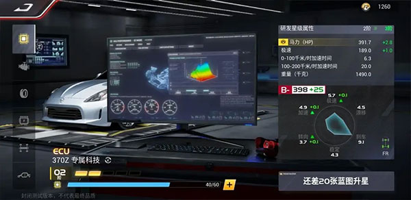 「ECU」是赛车性能改装最为重要的一部分,它可以全面提升车辆的性能。满级共五阶,其中一阶升二阶所需30个蓝图材料,升级后马力从366.0提升到368.9;极速从180.0提升到181.0;0-100千米/时加速时间从6.8降低到6.7。