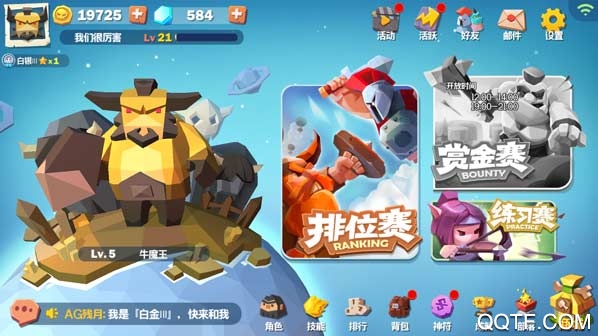 《部落崛起》其实很简单的玩法,我们可以看到玩法就排位赛、赏金赛以及练习赛,然而这些玩法都是可以个人或组队一起玩的,每一场赛事都是随机匹配,以6分钟为一局的竞技赛,在战场上你可以疯狂的锤锤捶,疯狂的刷宝箱获得最好的装备,在时间结束之后获得钻石最多的,击杀人数最多的将为王者。当然每完成一场比赛,都会有对应的奖励。