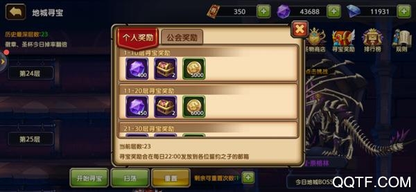 同时,每天可以重置一次当前探险层数,让其回退到20层,对于没有时间的小伙伴,也可以使用扫荡功能进行挂机寻宝,能够自动探险到历史最深层数。