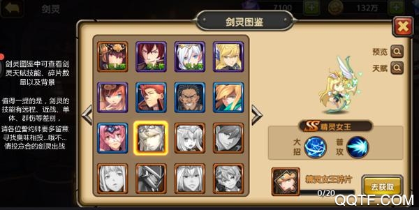 游戏中的剑灵有很多种,品质分为蓝A、紫S、橙SS三个品质,每个剑灵都拥有自己的专属技能,在剑灵图鉴中可以看到剑灵的详细信息。