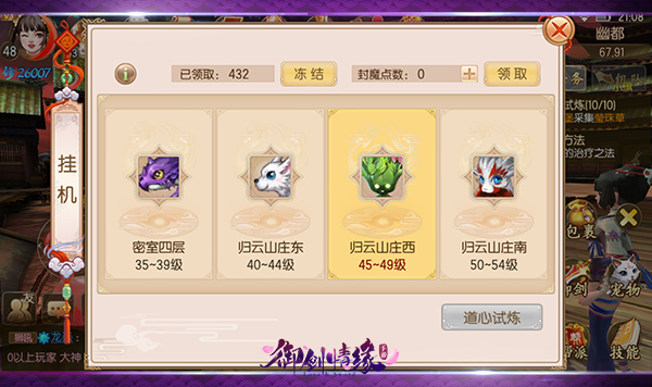 在《御剑情缘》中玩家最关心的也就是等级提升了吧,新手前期可以跟随主线来到18级左右,这时主线有一个需要玩家提升至19级才可接取下一个主线任务,这时玩家们需要通过完成日常活动“仙缘试炼”来升至19级,同样在“活动”中例如:青书考、封魔、万妖塔对于玩家的等级提升有不小的帮助,另外在“福利─客栈”中每天免费打听一次经验可以使完成以上活动后获得额外经验。如果你外出有事可以让自己的角色通过“挂机─道心试炼”领取每天200点封魔点数,参加封魔任务,获取的经验翻倍。