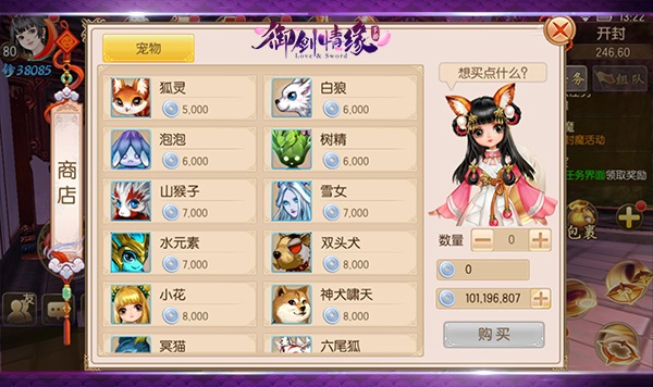 宠物在《御剑情缘》中可以跟随玩家战斗,为玩家增添战力,宠物的品质有野生、宝宝、变异三种,其中刚获得的宠物一般都是野生的,玩家可以通过道具“洗髓丹”来为自己的宠物进行洗髓,洗髓后一般都是宝宝,有极小几率成为变异宠物。在新手主线中我们可以获得第一只宠物“狐灵”,而随着等级提升至35级,我们又能在“福利─等级福利”中领到一只“白狼”,而怎么获得更多种类的宠物呢,这就需要我们去一般主城中寻找名为“宠物商人”的NPC进行购买了。