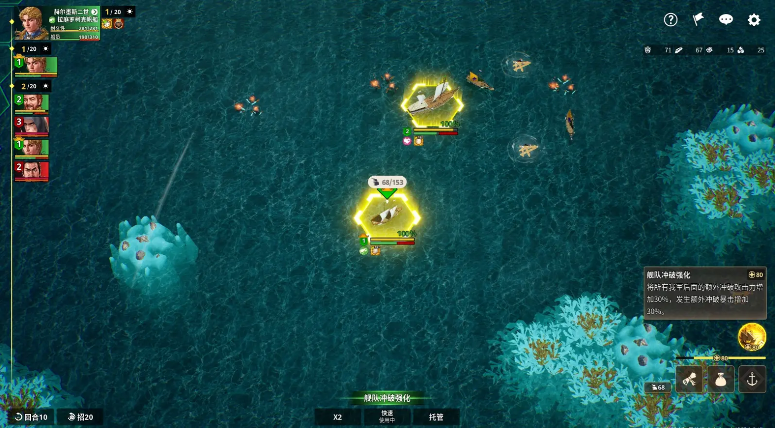 冲破:直接冲撞敌方船只造成耐久度伤害,仅当与敌方船只处于同一直线上时可使用;我方船员体力过低时,冲破伤害会减少。